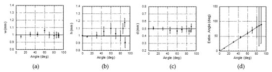 Let us analyze now the effect of the angle of the heat source on the quality of the retrieved parameters. In Figure 10, we present values of the retrieved w, h, d, and φ for the same standard heat source w = h = 1 mm, buried d = 0.5 mm below the surface, as a function of the inclination φ, also excited with a τ = 5 s burst. The signal to noise ratio of the data is SNR = 60.