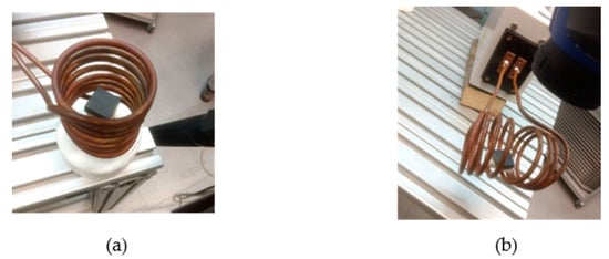 Photographs of the sample inside the coil for different orientations of the Cu slab with respect to the sample surface (painted in black): (a) φ < 45° and (b) φ > 45°.
