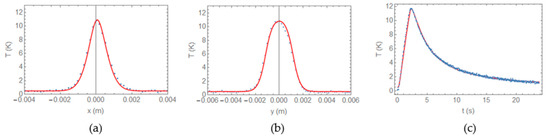 Experimental (blue symbols) (a) T(x,0,0,τ), (b) T(0,y,0,0,τ), and (c) T(0,0,0,t) obtained with a w = h = 2.1 mm Cu film making an angle of φ = 60° with the surface and buried d = 0.4 mm, excited with a τ = 2 s burst. The red solid lines represent the best fittings to Equations (10) and (11).