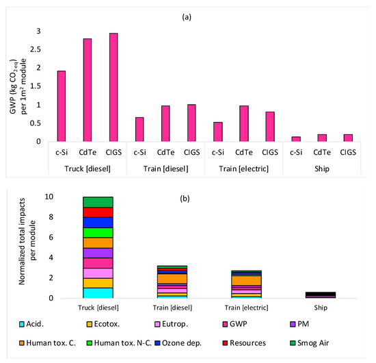 Environmental impacts of transportation of PV module (a) global warming potential (GWP) emissions of transportation (b) total normalized environmental impacts of PV transportation. Note that the calculations for transportation vehicles were performed assuming the average weight of PV module as 20 kg.