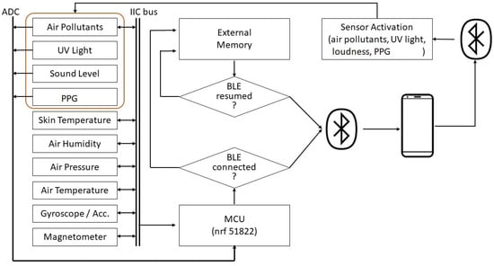 The fundamental concept is to construct the hardware in z-direction (3D-MPL approach). Each task and parameter is implemented through mounting the sensor/actuator (or number of sensors from the same domain) on the same physical layer. These layers are located one on top of another through a board-to-board connector. Therefore, -plane remains unchanged (in contrast to other prototypes/products) but the height of the prototype is expanded slightly—but still appropriate for a wrist-worn device. The connectors provide signaling between layers and the main platform. The measurements are displayed on the prototype and transmitted to the smartphone in real-time. The smartphone is used as mid-term storage and gateway to a server for permanent storage and data analysis. We support the prototype configuration in BLE connected mode by sensor activation/deactivation. Thus, we develop a smartphone application for bidirectional data communication between the prototype and the smartphone. User activates the intended sensor by pressing the respective button on the application and the data are measured, processed, and transmitted to the smartphone. Upon the pressing the button, a string including the sensor’s name is transmitted from the smartphone which is handled on the prototype. This string is used as a condition for sensor activation. We apply centralized data processing and a strict data protection policy. All sensors are connected and communicate to microcontroller via Inter-Integrated Circuit (IIC), Analogue to Digital Converter (ADC), or a combination of both interfaces. Behavioral sensors, air condition sensors, and skin temperature are supported with IIC, PPG sensor, loudness, and UV are supported with ADC, and gas sensors are taking the combination of both for initialization and configuration. The data from all sensors are pre-processed and processed on the prototype prior than transmission to the smartphone. This includes filtering the noise, pattern creation, and data conversion to the target data unit. All data are either transmitted directly via BLE or stored in the integrated memory, if BLE connection temporarily is unavailable (see Figure 1 and Algorithm 1).