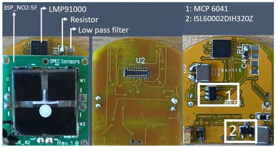 It includes a 24-pin board-to-board connector, a gain adjuster, a front-end amplifier (LMP91000, Texas Instruments, Dallas, TX, USA), and a signal filter. To improve signal quality during calibration, the voltage reference is strictly held. Thus, in addition to the microcontroller voltage reference, we use a voltage reference chip (Intersil ISL60002DIH320Z-TK). We implement a low-pass filter to eliminate ripples. To tackle the possible mismatch impedance between the output signal of the gas sensor and the ADC micro-controller, a gain unity buffer (MicroChip MCP6041T-I/OT) is used (Figure 2).