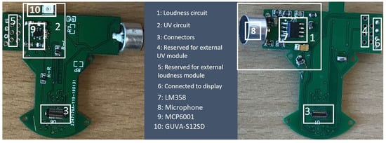 The physical layers, sensors, and the display are connected to this layer from three sides. It interconnects the gas layers (Layers 1 & 2) to main platform (Layer 4). Furthermore, it hosts the microphone and UV sensor. We designed and implemented sound (LM358) and UV circuits (GUAV-S12SD) to fit the board (Figure 3).