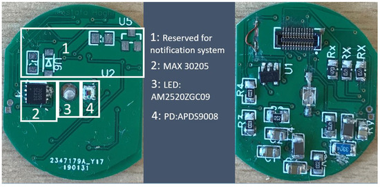 This layer holds the biomedical sensors. We locate the layer at the very bottom in direct contact to the user’s skin. Skin temperature (MAX30205) and Photoplethysmography (PPG) are measured by the sensors mounted on this layer (Figure 5). It connects the bottom of the host platform and communicates with the microcontroller via the IIC bus at a 15 s time interval. We detect the PPG by optical sensing. The PPG sensor consists of light emitting diode (AM2520ZGC09) and photo diode (APDS9008). Currently, we process the PPG signal to analyse and determine the heart rate only but further parameter extraction (e.g., breathing rate) is planned.