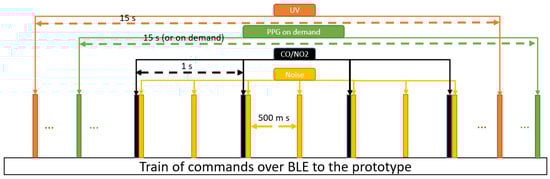 Sensors as well as data communication consume energy. For instance, the PPG uses an optical sensor that requires high energy. In contrast to other wearable devices, we suggest bidirectional communication to activate/deactivate particular sensors through commands from the smartphone. In our implementation, the user presses buttons to send these commands, but task- or measurement-depending automatic commands can easily be implemented, too. This feature supports an anytime-anywhere-anything-anyone concept in wearable devices. In the manual setting, the wearer can decide at what time and in which location what type of data is collected. In our prototype, we use it for gas, sound level, UV light, and PPG (PPG implementation is tested in debugging mode). This concept targets the applicability of the prototype and the monitoring status. We briefly describe, how the developed software application, the feature, and prototype are acting as the complementary items to support this concept.