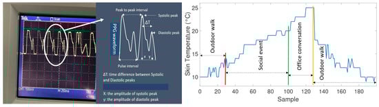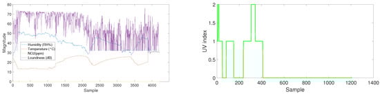 This test aims at testing the general functionalities of environmental conditions consist of humidity, air temperature, sound level, and sensors. All conditions of using the prototype stated in the Section 2.4 are applied in this experiment. A male subject carried out the experiment during a daily routine. As the test was subjected to measure the environmental parameters, we have strongly recommended the user to not cover the prototype by dressing appropriately. The device was worn on left-hand, with outside-oriented microphone for 75 min, and 4500 samples of sound level, 2250 samples of air humidity and temperature, and 300 samples of were collected (Figure 9—Left). In particular, the user performed an outdoor test using different modes of transportation (train, bus, and walking). According to the reported protocol, the samples from 1250 to 2200 and from 2450 to 3350 belong to riding the bus and train, respectively. The interval between samples 170 and 1100 indicate higher loudness and lower temperature. This period corresponds to the outside walk. As expected, temperature and humidity are in a reverse correlation. Nguyen et al. consider this indicating proper functionality of the sensors and platform [].