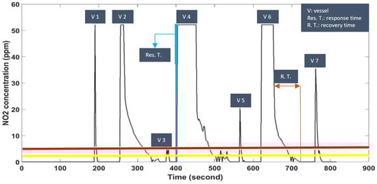 The test was performed by a technician wearing the prototype. The set up, configuration, sampling rate, and location of the prototype are the same comply with the regulations stated in Section 2.4. We have asked the subject to fold up the sleeve to avoid covering the sensor. As the part of chemical tests at center for life science automation, the digestion acid of vessels in microwave is performed. These vessels contain high concentration of which are measured by opening the lead. This is a realistic performance of chemical technicians which more often is implemented. Thus, we decided to do this experiment, testing the air pollutant sensor of the prototype exposed to hazardous gases. The reason was to carefully check the characteristics of sensor (response time, recovery time, resolution, and spin). This also can be an application of the prototype in safety monitoring of workplaces for chemical laboratories. Following the laboratory’s safety conditions, seven vessels of microwave digestion are opened one after another (Figure 10). As this was a realistic experiment with hazardous air pollutants in chemical laboratory, at the day of experiment the number of sampling vessels prepared by the technician were seven. This does not indicate any specific reason.