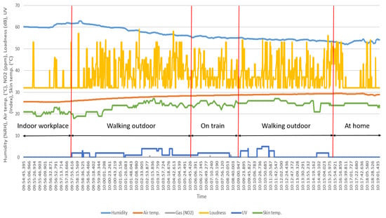 We tested the functionality of the all layers and prototype comprehensively, indoors as well as outdoors. The test lasts from several minutes to a few hours up to days (30 h is the longest after battery charging). In general, six prototypes have been tested by five volunteers including three males and two females aged 26 to 48 years old. Users have been from different occupations ranging from ordinary workers with no technical information on the functionalities of the prototype to scientists in the fields. In every experiment, the user has been asked to wear the prototype on the top side of left-hand with outside-oriented microphone, in a good skin contact and comfortable. Users have been recommended to wear the prototype in a fix location on the left-hand to avoid moving the prototype. Besides, we have strongly asked the subjects to avoid covering the surface and microphone of the prototype. All users have been trained to only switch on/off the prototype, pair BLE, and configure the prototype with the application. Additionally, each user has been asked to avoid interruption of the data transmission unless otherwise necessary. At the end of each experiment, user has reported the technical problems and data interruption, if any. Each user also submitted the written protocol, specifying the activities and switching time between, if applicable. In each test, the prototype was BLE-paired with a smartphone, which starts the bidirectional data transmission. If activated, the sensors have sampling rates of sound level (2 Hz), gas (1 Hz), UV radiation (15 s time interval), air temperature (1 Hz), air humidity (1 Hz), air pressure (1 Hz), skin temperature (15 s time interval), PPG (15 s time interval), gyroscope (50 Hz), magnetometer (50 Hz), and accelerometer (50 Hz). During the tests, the prototype measured a surrounding sound level of 32 to 85 dB, with the resolution of 1 dB. and are limited to 52 and 1680 ppm with the resolution of 1 and 5 ppm, respectively. This specification for UV index is restricted up to 9 with the resolution of 1. For all tests, we extracted the presented data from the smartphone in Comma-Separated Value (CSV) format. The sampling rates, specified above are constant and have been applied in every experiment. We have not imposed any specific conditions/restrictions to users, unless otherwise it is clearly stated. Hereafter, we will support the functionaries of the prototype with two types of tests: from Section 3.1, Section 3.2, Section 3.3, Section 3.4 and Section 3.5, the experimental tests are focused on the detail description of the tests for each sensor and the respective parameters. In these sections, the general conditions and specifications mentioned in Section 2.4 are applicable. However, if additional conditions have been available due to the nature of experiment(s), will be reported in the that particular subsection. We support the comprehensive functionaries of the prototype, data synchronization, accurate time stamp, and labeling the activities in Section 3.6.