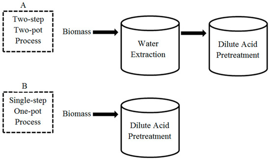 A two-step process, consisting of prewashing and a subsequent pretreatment process was recommended to extract considerable amounts of water-soluble sugars to avoid sugar losses or degradation during the pretreatment stage [23]. However, the economic viability of adding an extraction step is questionable due to the increased process cost due to high water usage [24]. Instead, a single pretreatment step without the pre-extraction processing, i.e., a “one-pot” process, was proposed to recover the water-soluble sugars and improve the enzymatic digestibility of cellulosic biomass. The improved digestibility was based on the possibility that sucrose or its immediate hydrolysis products, glucose and fructose, will survive the pretreatment step and will be available to fermentative microorganisms [25].