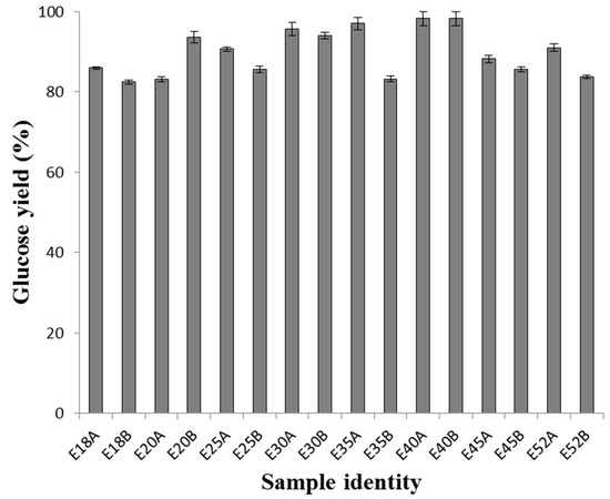 The reaction temperature in dilute acid pretreatment ranged from 120 to 160 °C, while sulfuric acid levels were in the range of 0.5 to 2% (w/w) [12,35]. The yield of reducing sugars through enzymatic hydrolysis was mainly influenced by acid concentration, reaction temperature, and reaction time. Acid hydrolysis releases oligosaccharides and monosaccharides but also results in the formation of degradation products such as aldehydes. In order to reduce the decomposition of the sugars, a hydrolysis time of 60 min was used in this study. Dilute acid-pretreated sorghum stalks demonstrated good enzymatic digestibility with more than 82.4% glucose yield for all the treated samples (Figure 2), which showed that the dilute acid pretreatment condition of reaction temperature 120 °C for 60 min with 2% (w/v) sulfuric acid was sufficient to disrupt the rigid cell-wall structure of sorghum biomass and significantly improve the enzymatic hydrolysis of treated sorghum biomass. Half of the selected sorghum mutants achieved greater than 90% glucose yields with a maximum glucose yield of 98.2% for sample E40B.