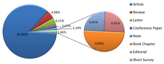 Through the above-mentioned search criteria, 241 research publications were retrieved within the 20 years period (2000–2019). Of these, 85.89% (n = 207) were Original articles, while the others, 14.11%, correspond to Reviews, Letters, Conference Papers, Notes, Book chapters, Editorials, and Short Surveys respectively (Figure 1).