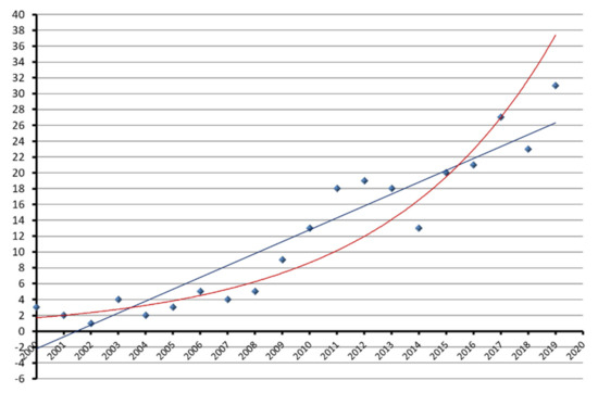 Chronological distribution of scientific Production. Linear adjustment (blue): y = 1.5015x – 3005.2 (r = 0.8856). Exponential adjustment (red): y = 8E-142e0.1627x (r = 0.8695).