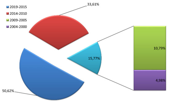 The distribution in 5-year periods shows that the time frame 2019–2015 contains the most documents, with more than 50% of the total, as displayed in Figure 3. It also reflects a 34.78% increase with respect to the previous period, and an average of 42.32% in the last 4 five years, illustrating the great interest that this topic has lately generated.