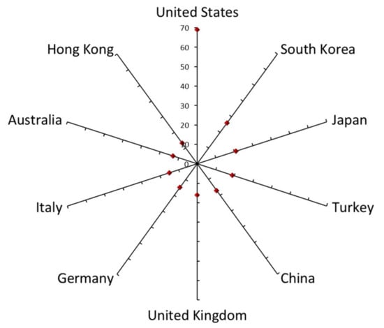 Figure 4 shows the geographical distribution of the documents analyzed, while Figure 5 shows the most important institutions in scientific production in this field. From this analysis, it should be noted that four countries account for about 50% of total production. The United States was the most productive (n = 69), whose Participation Index (PI) is 28.63, followed by South Korea (n = 26; PI = 10.79) and Japan (n = 21; PI = 8.71). As for the most productive institutions, they are University of California San Diego, Seoul National University Bundang Hospital and Seoul National University College of Medicine (Figure 5).