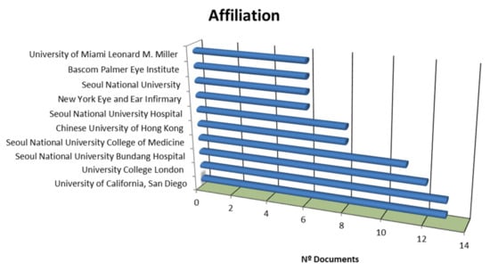 Table 3 shows the top 10 most productive authors in the detection of optic nerve and NDD based on decreased retinal thickness research. It should be noted that among the 10 most productive authors, five are from South Korea. Likewise, the importance of the authors who research on this topic is demonstrated, since among the first 10 we find seven with an h index above 30 and four above 40. If we take into account the p index, there are three authors above 1.6.