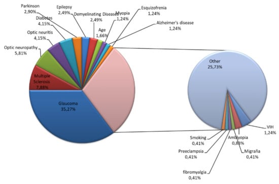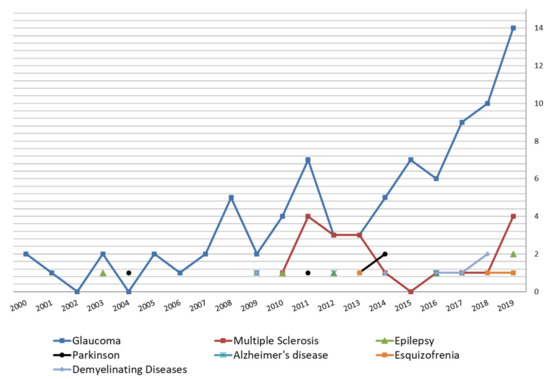 The first documents referring to neurological diseases are from 2003 and 2004 (epilepsy and Parkinson’s respectively). In the 2003 study by Viestenz et al. [61], vigabatrin, used in epilepsy, was reported to damage the optic nerve. However, subsequent studies showed decreased RNFL thickness in patients without prior exposure to this drug [5,62]. Also in Parkinson’s disease, studies suggest that there is a decrease in RNFL [2,63].