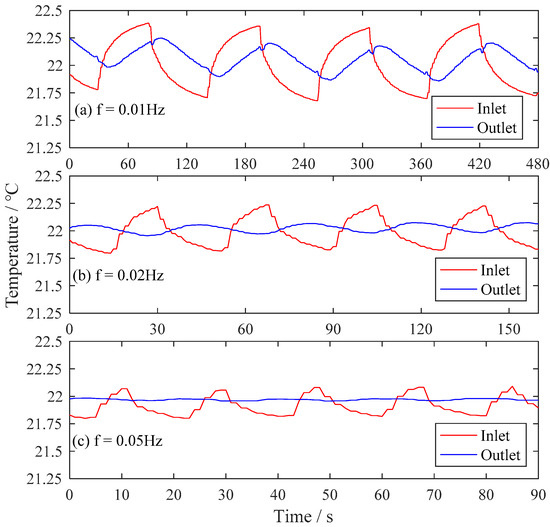To evaluate the performance of the developed DTFM attenuator, CCW with different temperature fluctuations was introduced as the input of the DTFM attenuator, and the temperature curves of the inlet and outlet of the DTFM attenuator were recorded as shown in Figure 5. The temperature fluctuation of CCW was significantly reduced by the developed DTFM attenuator.