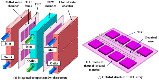 As shown in Figure 6, two layers of TEC arrays sandwiched the CCW chamber with the cold sides of TECs. The hot sides of the two TEC arrays were both covered with chilled water chambers. Each TEC array was placed in a frame, which was made of a thermal isolation material to avoid thermal conduction between the two sides of the TECs.