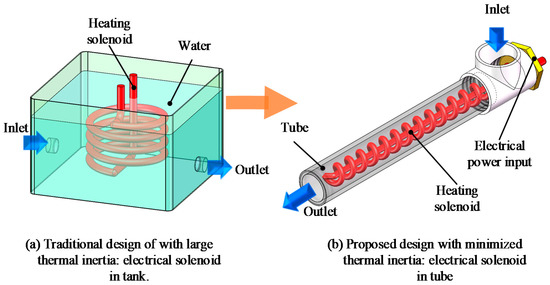 As shown in Figure 7, the heating module based on a ‘solenoid-in-tube’ structure was proposed to achieve minimal thermal inertia. The electrical heating solenoid was assembled in a long thin tube that the CCW flows through. Since the heating solenoid features a sub-second response time, and its heating power is proportional to the electrical power applied, heating power can be controlled with sub-watt level resolution. Compared to conventional heating module design, in which the electrical solenoid is immersed in a water tank, the proposed heating module can achieve agile thermal control. The developed heating module is ϕ 30 mm × 200 mm (diameter × length) in size, and has a maximum heating power of 1.5 kW.
