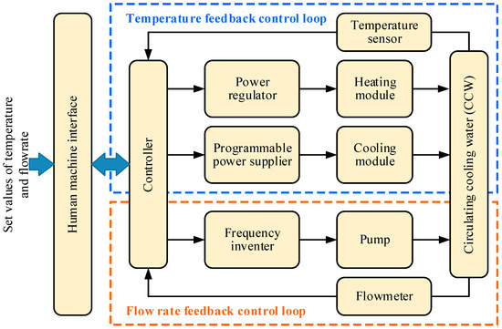 As shown in Figure 8, the control sub-system of the enhanced CCW machine consists of the temperature feedback control loop and the flow rate feedback control loop. The temperature sensor at position A and the flowmeter at position B, as mentioned in Figure 1, provide temperature feedback of CCW, and flow rate feedback of CCW, to the controller, respectively. The heating module is driven by the power regulator, meanwhile, the cooling module is driven by the programmable power supplier.