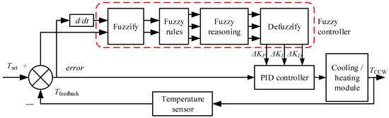 A control algorithm based on a Fuzzy-PID was employed to obtain better performance of CCW temperature control, since the Fuzzy-PID can deal with nonlinearity, time variety, and large time delays of the CCW temperature control system [19], as shown in Figure 9.