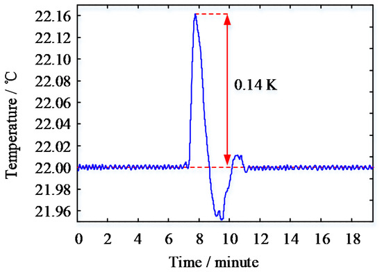 Then, the experiment of thermal impact response was carried out to validate the performance of thermal impact resistance of the developed CCW machine. A 500 W thermal load was introduced by the programmable heating device to make a step thermal impact. Experimental results indicated that the temperature of CCW recovered to a stable state in ~200 s after the thermal impact was introduced, and that the overshoot was about 0.14 K, as shown in Figure 13.