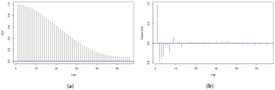 Correlation plots for the original time-series. (a) AutoCorrelation Function (ACF); (b) Partial AutoCorrelation Function (PACF).