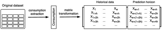 A preprocessing of the dataset had to be applied before it could be used. In particular, we used the preprocessing strategy proposed in [36], which is graphically depicted in Figure 2. In a first step, we extract the attribute corresponding to the energy consumption, obtaining in this way a consumption vector .