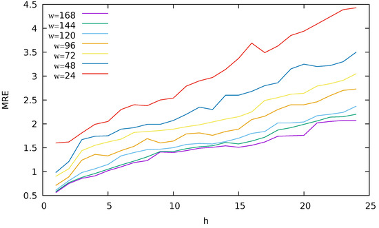 Before presenting the comparison with other methods, we inspect the results obtained by the proposed strategy for each historical window value used (w) and each subproblem (h). Figure 3 shows a graphical representation of the results obtained, showing the associated MRE for different values of w, when varying the length of h. We can see that the best results were achieved when the forecasting is based on more historical data, i.e., for higher values of w. In fact, the best results were obtained for . Analogously, the MRE increases as h becomes longer. The proposed strategy obtains similar results for on all the considered values of the prediction horizon h.