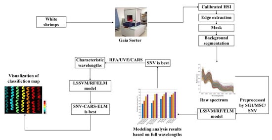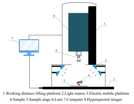 Traditionally, methods of instrument analysis and artificial sensory evaluation were used to identify the freshness of shrimps. Instrumental analysis methods have poor reliability, take a long time, and are not repeatable, and artificial sensory evaluation cannot accurately reflect the freshness of all products in real-time [8,9,10,11,12]. In the last few years, a great number of research workers have implemented hyperspectral imaging techniques to detect the freshness of various products. Compared with the methods of instrumental analysis and artificial sensory evaluation, hyperspectral imaging technology is characterized by accurate prediction, low cost, and non-destructive testing, etc. Accordingly, it is widely used in the field of food freshness detection [13]. Dai et al. [14] built a numerical model of wavelet characteristics and criterion total volatile basic nitrogen (TVB-N) content by using a visible/near-infrared hyperspectral imaging (HSI) system combined with wavelet profiling methods and three regression algorithms, and eventually determined that the least squares support vector machine (LSSVM) model was the best model for shrimp TVB-N content inspection. The authors also developed an image processing method for TVB-N detection, which was capable of rapidly determining the TVB-N content of shrimp during refrigeration. Yu et al. [15] assessed the freshness of shrimp during refrigeration and depending on the TVB-N content of the shrimp, proposed that shrimps could be divided into two grades of freshness: fresh shrimp and stale shrimp. By using hyperspectral imaging technology, the spectral characteristics were taken from the raw hyperspectral data by a deep learning algorithm, the freshness of the shrimp was then determined by an LR-based deep learning algorithm. The study demonstrated that the classification accuracy of shrimp freshness by stacked auto-encoders logistic regression (SAEs-LR) reached 96.55% and 93.97% on the calibration and prediction sets, respectively. In addition, some scholars at home and abroad had studied the freshness of other aquatic products through near-infrared hyperspectral imaging technology. Sivertsen et al. [16] distinguished between fresh and freeze-thawed cod fillets by using VIS/NIR hyperspectral technology combined with machine vision, by which high classification accuracy was acquired and the freshness of each fillet could be determined and the number of frozen days could be evaluated with a precision of 1.6 days. Cheng et al. [17] used VIS/NIR hyperspectral imaging technology (400–1000 nm) combined with classifier and spectral pre-processing technology to distinguish fresh, frozen (4 °C, 7 days) and frozen-thawed (20 °C, −40 °C, 30 days) grass carp slices. Four kinds of classifiers were used to establish classification models and classifier analysis combined with hyperspectral imaging could quickly distinguish between frozen, frozen-thawed, and fresh fish slices. The modeling results showed that the classification accuracy peaked at 92.29% and hyperspectral imaging technology combined with classifier analysis had tremendous potential for online inspection. As a new generation of inspection technology, NIR hyperspectral imaging technology is developing well for aquatic product quality inspection as it can simultaneously obtain unique spectral and image information for each pixel of an object’s surface [18].