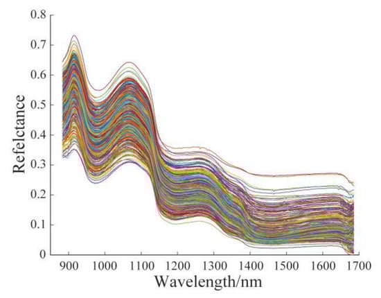 “GaiaSorter” near-infrared high spectrometer was used in the experiment. The system is equipped with electronic control mobile platform, 56 mm fixed focus near-infrared lens, unified light source consisting of four 200 W tungsten bromide lamps, computer box, hood, etc. The spectral range is from 866.4 nm to 1701.0 nm. The imaging mode of “GaiaSorter” near-infrared high spectrometer is line scanning. The imaging spectrometer forms an image of a line on the target each time and splits the light so that each spectral component corresponds to a pixel on the line array. As shown in Figure 1, the working mechanism can be described as follows: the experimental samples are placed on the electronic control mobile platform, and the hyperspectral cube information of the sample to be tested is obtained by the push-broom method.