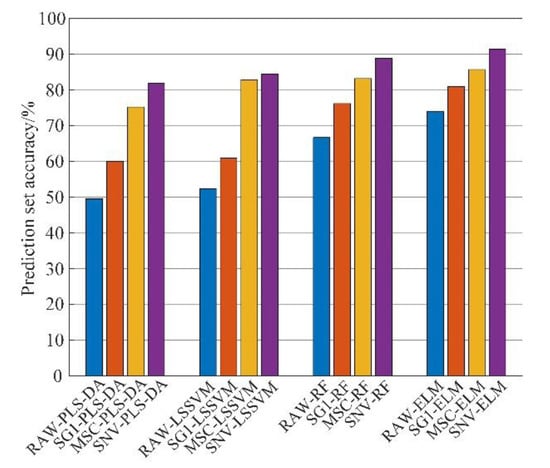 To determine the optimal combination of preprocessing methods and models, raw spectral data and spectral data preprocessed by SG1, MSC, and SNV were entered into PLS-DA, LSSVM, RF, and ELM discriminant models for comparison. Figure 5 displays the accuracy of the prediction set of the above full wavelengths preprocessing methods combined with PLS-DA, LSSVM, RF, and ELM discriminant models, in which RAW represents the original spectral data. The analysis yields that the SNV-processed spectral data modeling accuracy is the highest and the prediction set has higher accuracy than that of the other two preprocessing methods and the original spectral data. This result arises from the differences within the samples and other factors. The hyperspectral instrument used in this experiment may lead to light scattering and further generate noise. SNV uses the average value and standard deviation as the correction parameters, which eliminates the differences within the samples and light scattering to a large extent [28].