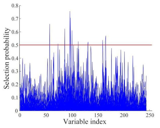 Figure 6 shows the selection probability of each characteristic wavelength extracted by RFA, which is acquired by setting the number of iterations N to 1000 and the number of initial variable M to 2. Since the random frog algorithm is based on Monte Carlo (MC) thought, in order to approximate the optimal solution, it needs to be run multiple times and the results are statistically calculated. A total of 50 RFAs were run in this experiment, and the average value of the 50 runs was used as the basis for the final characteristic wavelengths selection. As can be observed from the figure, the majority of the variables have a low probability of being selected, and only a small number of variables have a high probability of being selected. The experimental threshold is 0.5, which is represented by a red horizontal line, and 11 variables whose probability exceeds the threshold were selected as characteristic wavelengths. Table 1 shows the characteristic wavelengths and the corresponding molecular vibration extracted by RFA [29]. The extracted characteristic wavelengths account for 4.51% of the full wavelengths.