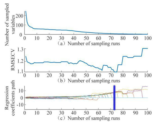 CARS is an effective method of data dimensionality reduction. First, Monte Carlo (MC) sampling is used to forcefully remove a part of the wavelength points. Then, select the wavelength points with large absolute values of regression coefficients by adaptive reweighted sampling (ARS) technique and delete the wavelength points with small weighting coefficients. Meanwhile, by utilizing cross-validation, the subset with the minimum RMSECV value is selected, so the smallest variable subset is the best subset [23]. The optimal combination of variables can be found out effectively, and the variable with a larger absolute regression coefficient can be selected in multiple Monte Carlo operations to achieve the purpose of variable dimensionality reduction.