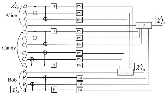 Assume that Alice intends to send an arbitrary qubit to Bob; at the same time, Bob intends to send to Alice, where and , while there is no GHZ state shared directly between Alice and Bob. Suppose that Candy previously shared a six-particle GHZ-GHZ state with Alice and Bob, respectively, as shown in Figure 3.