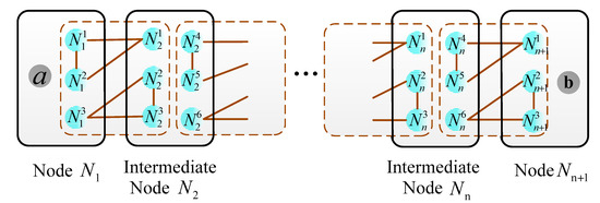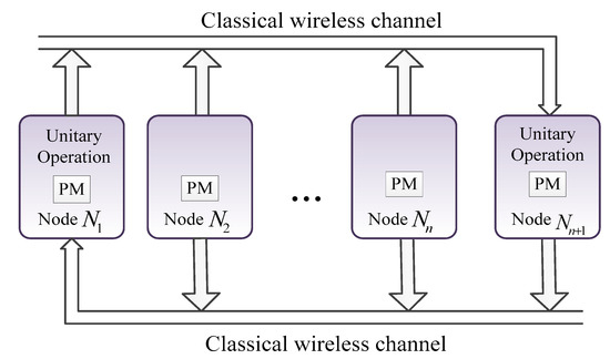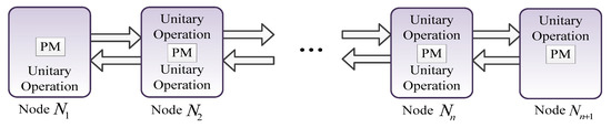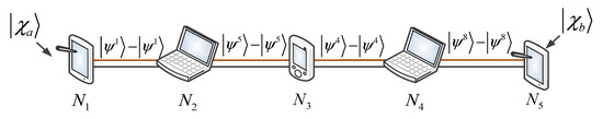 Specifically, in the n-hop case, the entanglement channel between the node and the nodes is shown in Figure 5. Assume that the node intends to transmit an arbitrary qubit to the node , while the node intends to transmit to the node at the same time, where and .