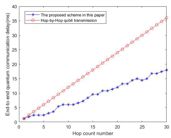 From Figure 9, it is obvious that our scheme has a shorter end-to-end quantum communication delay. In a wide-area quantum communication network where the hop count number n is large, our scheme shows obvious advantage in the end-to-end quantum communication delay.