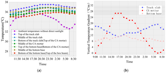 - Dai, G.-L.; Su, H.-T.; Yan, B. Experimental Study on the Vertical Temperature Gradient of Longitudinally Connected Slab Ballastless Track on Bridge in Autumn. J. Hunan Univ. Nat. Sci. Ed. 2015, 42, 94–99. [Google Scholar]