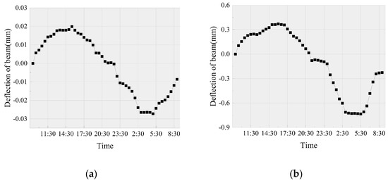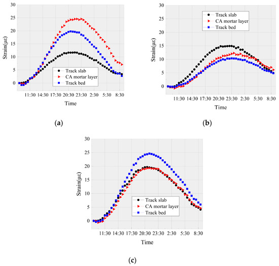 - During the 24-h test, the strain of each structural layer shows a sine curve periodic change of increasing first and then decreasing; because the strain time history law of the track system structure is affected by the hysteresis of the temperature change, the strain change of each structural layer has a certain lag along with the vertical depth. Due to the different temperatures at the beginning and end of the test, at 9:00 the next day, the strain of the track system structure at each location did not return to the initial state; the shear slots have a certain constraint on the track system structure, and the strain near the shear slot side of the structure is smaller than that on the other side.
