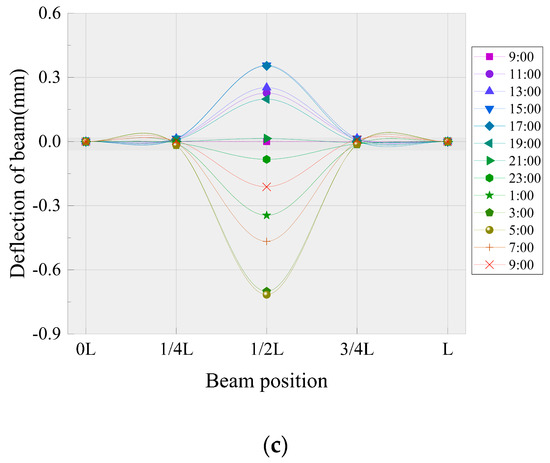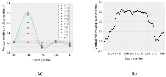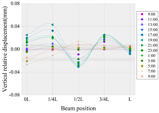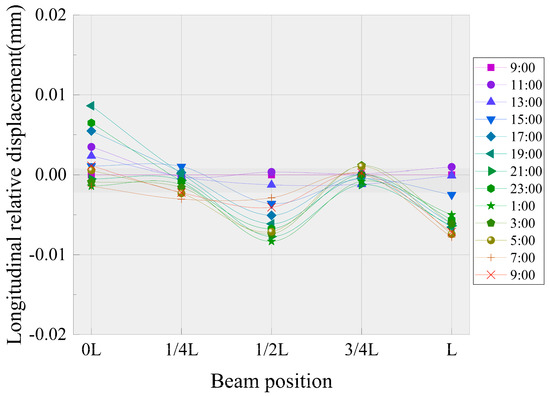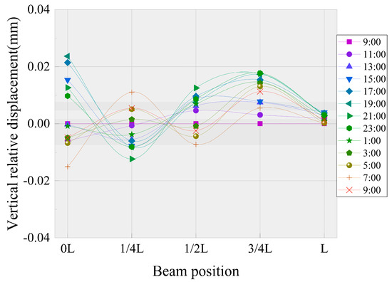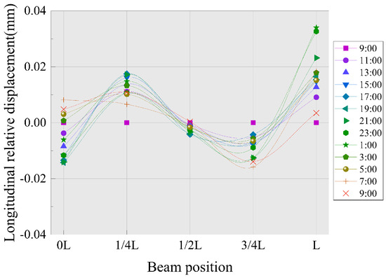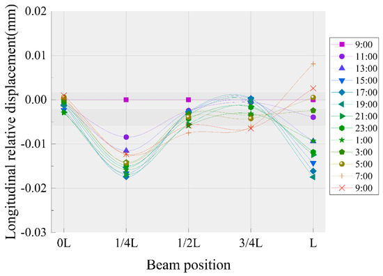 - Under the cyclic action of the temperature change in a single-day, the longitudinal and vertical relative displacements of the track system layers work together under the constraint of the beams, shear slots and track itself to realize the deformation of the track system; during the period from 17:00 to 23:00, the relative displacements of the whole layer are relatively small; due to the influence of the shear slots, the deformation of the track system and the relative displacement between the layers on the side near the shear slots (at section 0 L) are mostly realized by the track slab and CA mortar layer, while the relative displacement between the base plate and the beam body on the other side (at section L) is relatively large; the most unfavorable position is at section 1/4 L, where there is a peak value of the relative displacement between the layers, so this position should be considered.