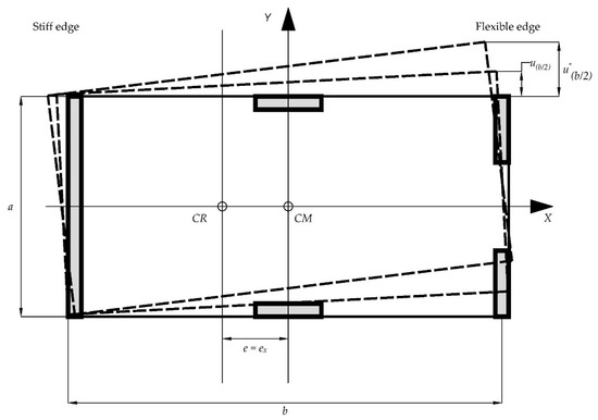 The response of the buildings due to accidental moment is measured by calculating building normalized edge displacements, , at a distance x from the center of mass. The increase in building response due to accidental torsion is estimated by defining the normalized displacement of the building plan at distance b/2 (see Figure 1) from the center of mass as the ratio between the displacement of the system including the effect of accidental torsion and the displacement of the system without accidental torsion as shown in Figure 1, such that;