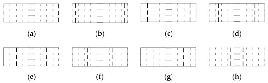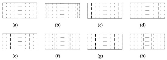 Building plans for second group of parametric study (with b/r = 1.4): (a) Building frequency ratio Ω = 1.4; (b) Building frequency ratio Ω = 1.3; (c) Building frequency ratio Ω = 1.2; (d) Building frequency ratio Ω = 1.1; (e) Building frequency ratio Ω = 1.0; (f) Building frequency ratio Ω = 0.9; (g) Building frequency ratio Ω = 0.8; (h) Building frequency ratio Ω = 0.7.