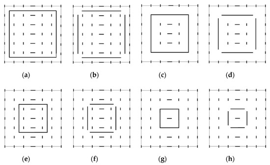 Building plans for third group of parametric study (with b/r = 2.45): (a) Building frequency ratio Ω = 1.5; (b) Building frequency ratio Ω = 1.4; (c) Building frequency ratio Ω = 1.3; (d) Building frequency ratio Ω = 1.15; (e) Building frequency ratio Ω = 1.1; (f) Building frequency ratio Ω = 1.0; (g) Building frequency ratio Ω = 0.85; (h) Building frequency ratio Ω = 0.7.