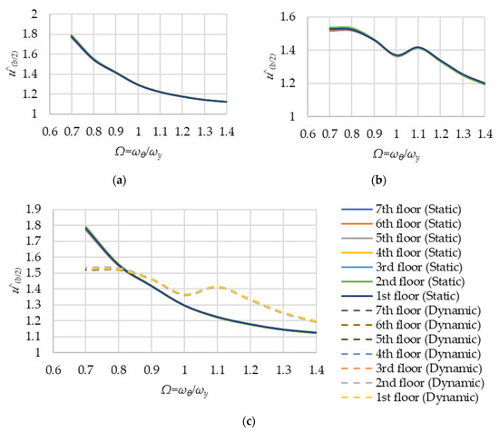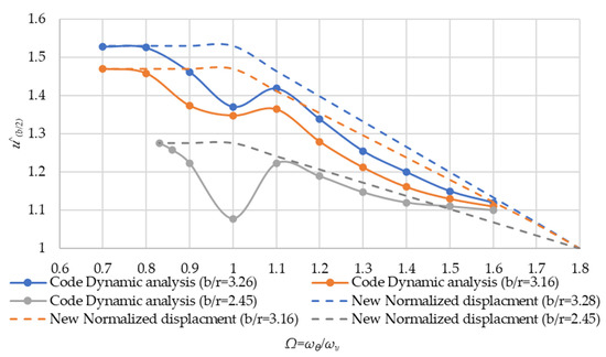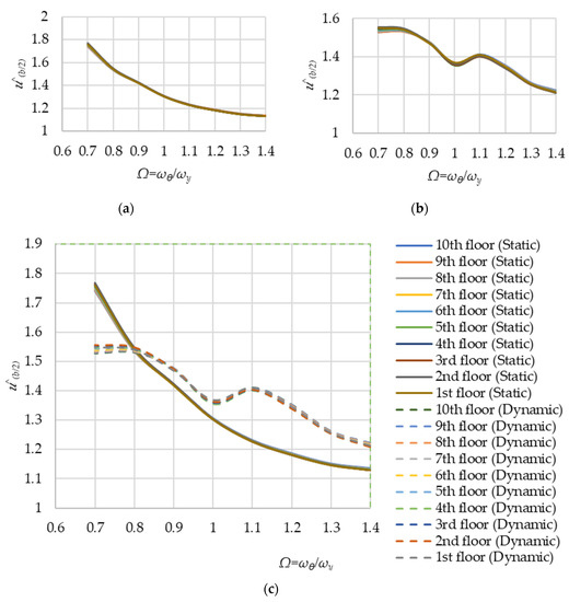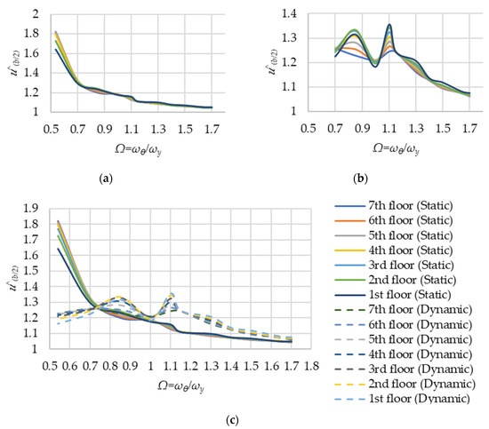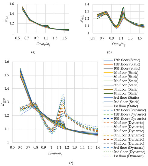 Static analysis produces more conservative assessment of accidental torsion compared to dynamic analysis for building systems with Ω < 1.0, as shown in Figure 1, Figure 2, Figure 3, Figure 4, Figure 5, Figure 6, Figure 7, Figure 8, Figure 9, Figure 10, Figure 11, Figure 12 and Figure 13. Moreover, for buildings with floor plan aspect ratio of 1.0, i.e., roughly square floor plan (b/r = 2.45), and having Ω << 1.0, static analysis is very conservative compared to dynamic analysis.