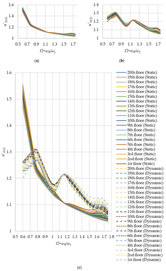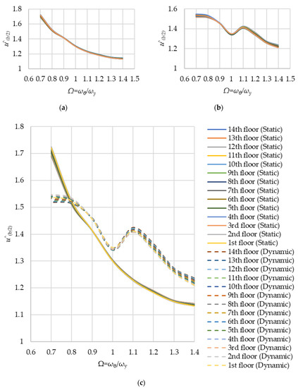 Normalized flexible edge displacement (with b/r = 1.4, Ty < 1 s): (a) Static edge displacement; (b) Dynamic edge displacement; (c) Static vs. dynamic edge displacement.