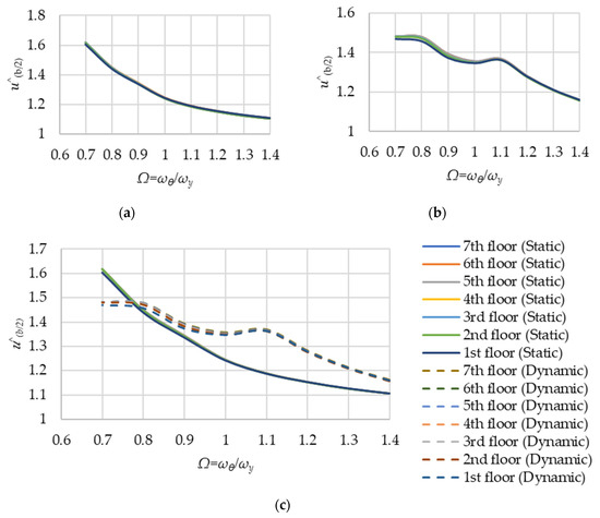 Normalized flexible edge displacement (with b/r = 1.1, Ty > 2 s): (a) Static edge displacement; (b) Dynamic edge displacement; (c) Static vs. dynamic edge displacement.