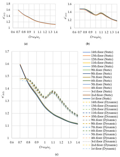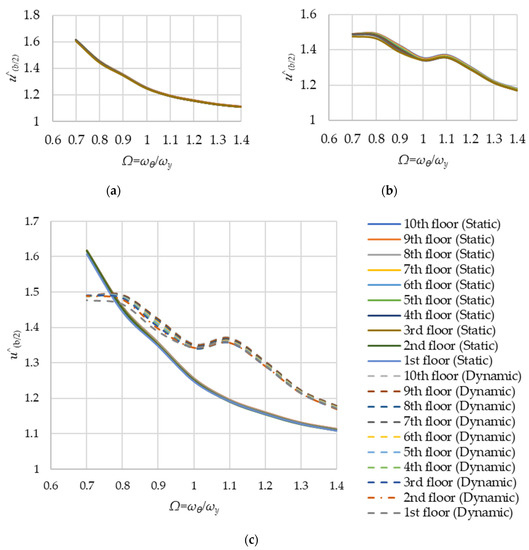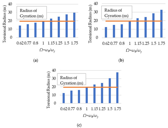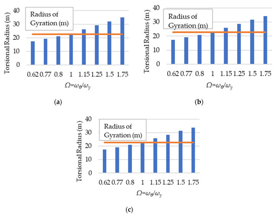 The angular frequency in general is proportional to the square root of the mass divided by the stiffness as indicated by Equations (2)–(5) [9]. The ratio of uncoupled torsional and lateral frequency, Ω, can be calculated by Equation (6). It is worthy to note that the uncoupled frequency is obtained from the structure mode shapes that include both translation and torsional vibrations and are beyond the scope of this article. On the other hand, the uncoupled translation frequency is obtained from a pure translational mode shapes and uncoupled torsional frequency obtained from pure torsional mode shape.