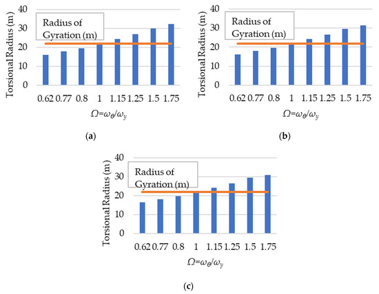 Clearly, the torsional radius increases with an increase in Ω, as this frequency ratio is in fact an indicator of the building torsional flexibility. Floor plan and its structural system may be viewed as torsionally rigid when the torsional radius is less than the radius of gyration which occurs when Ω < 1.0. On the other hand, a floor plan and its structural system is torsionally flexible when the torsional radius is larger than the radius of gyration which occurs when Ω > 1.0.