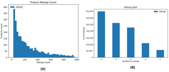 Distribution ratings of the ML-1M dataset: (A) Distribution of the quantity of products by a certain number of evaluations; (B) Total number of ratings for each scale value [1–5].
