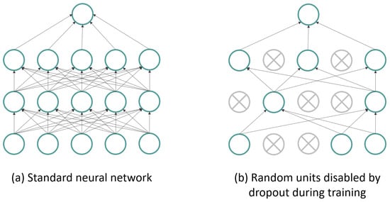 Figure 6 shows the final architecture used to obtain the results presented in Section 4. The architecture is similar to the one shown in Figure 5, differentiating itself by the addition of another layer—the dropout layer. This layer prevents model overfitting and provides a way to efficiently combine several different neural network architectures exponentially. The term dropout refers to the removal of units, both hidden and visible, from the neural network []. By dropping a unit, we mean temporarily removing it from the network, along with all its incoming and outgoing connections, as shown in Figure 7.